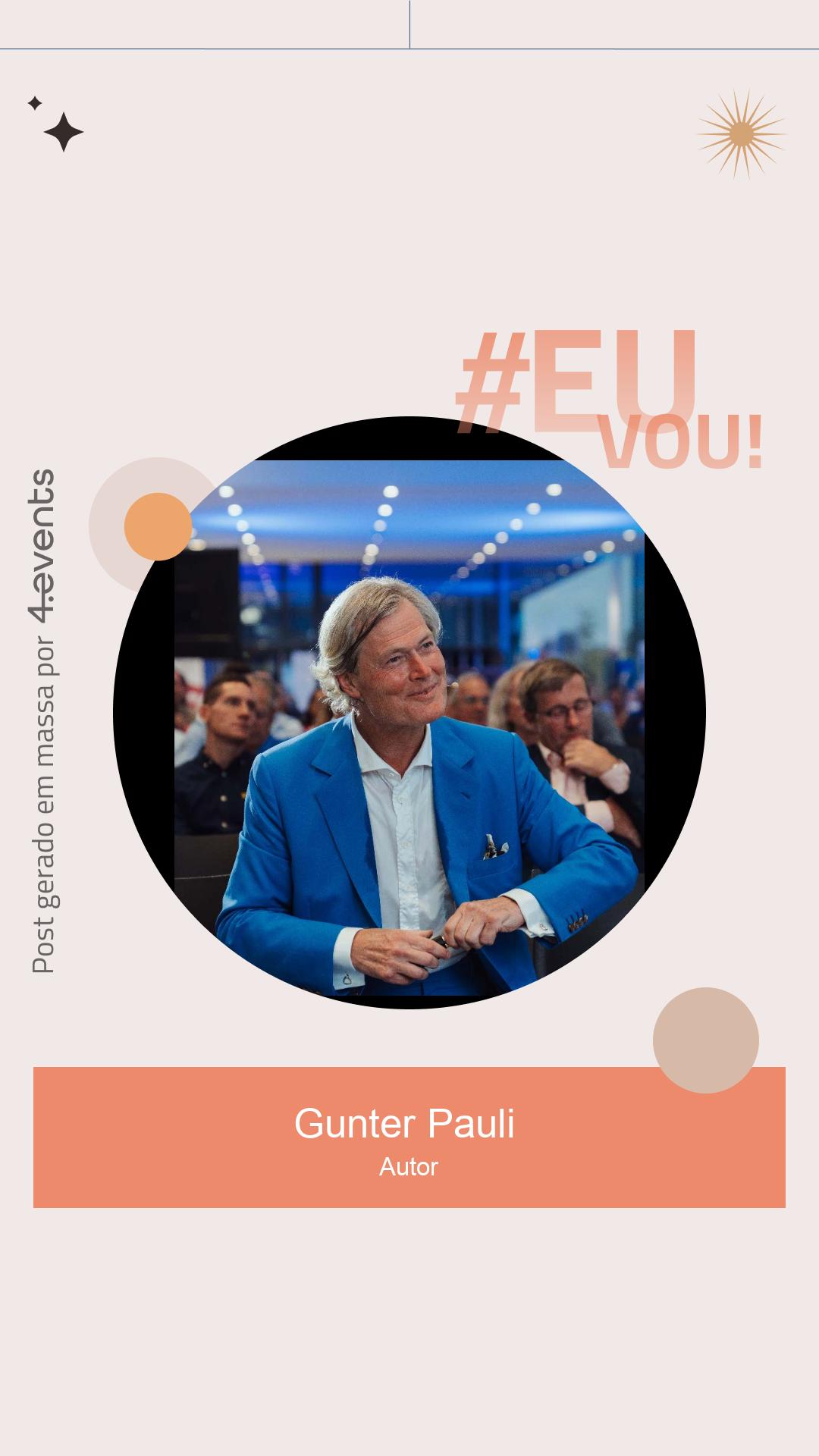 Gunter Pauli é um empresário, economista e autor nascido em 1956 na Antuérpia. Ele é mais conhecido por seu trabalho principal, The Blue Economy. Ele viveu em 4 continentes, é fluente em 7 idiomas, mora no Japão desde 1994 e passa a maior parte do tempo na África do Sul.