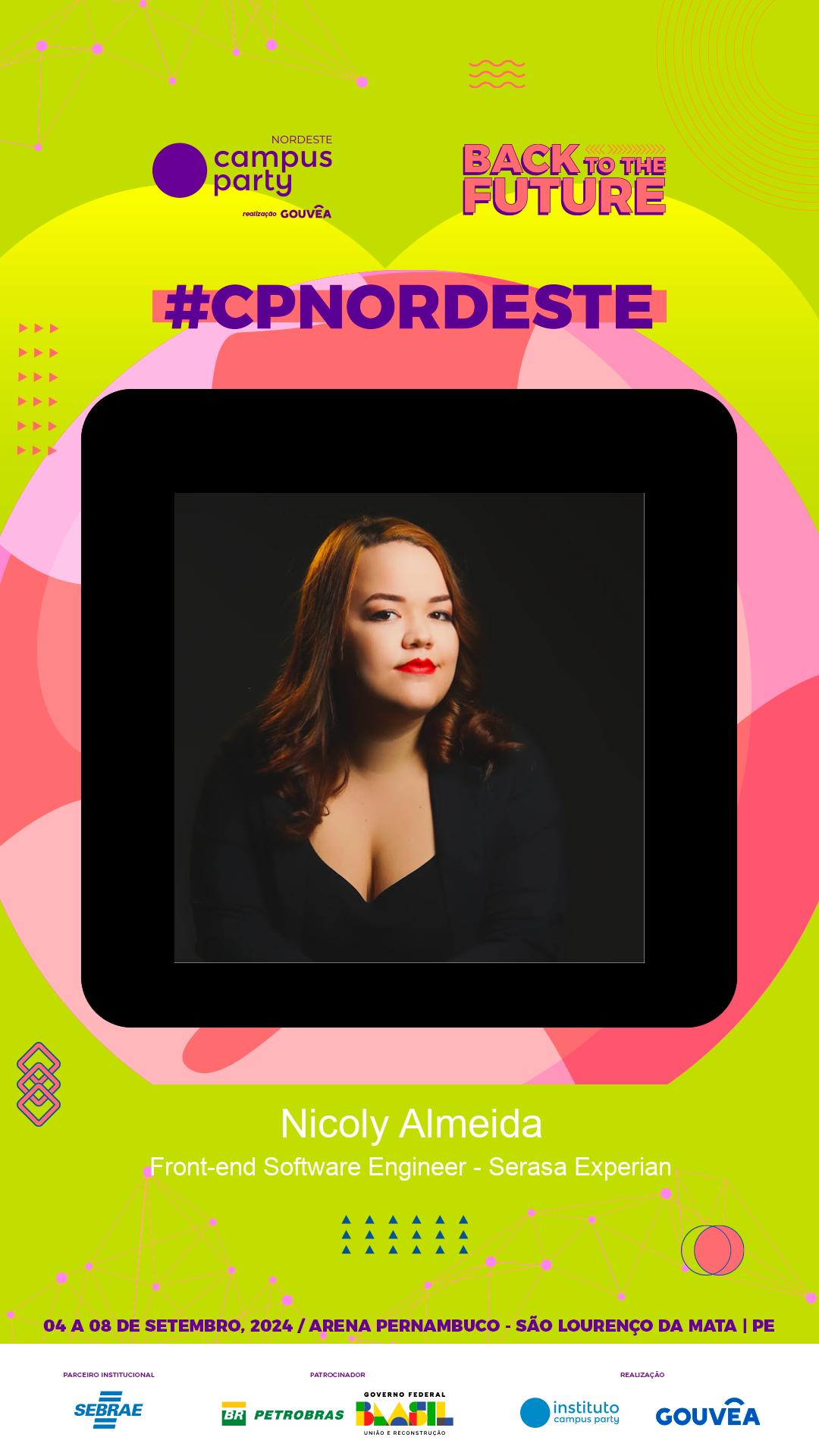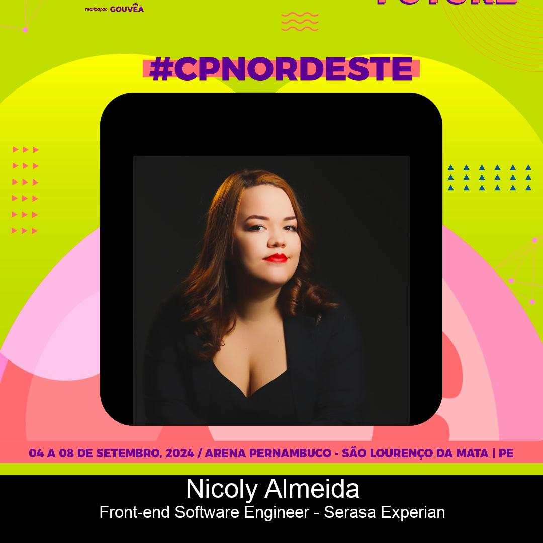 Nicoly Almeida é uma Engenheira de Software Front-end, Designer de UX e professora com ampla experiência em frameworks e tecnologias front-end. Nicoly também é palestrante, embaixadora do Women Techmakers e organizadora do Google Developers Group - João Pessoa, destacando-se por sua paixão por ensinar e conectar a comunidade de tecnologia.
