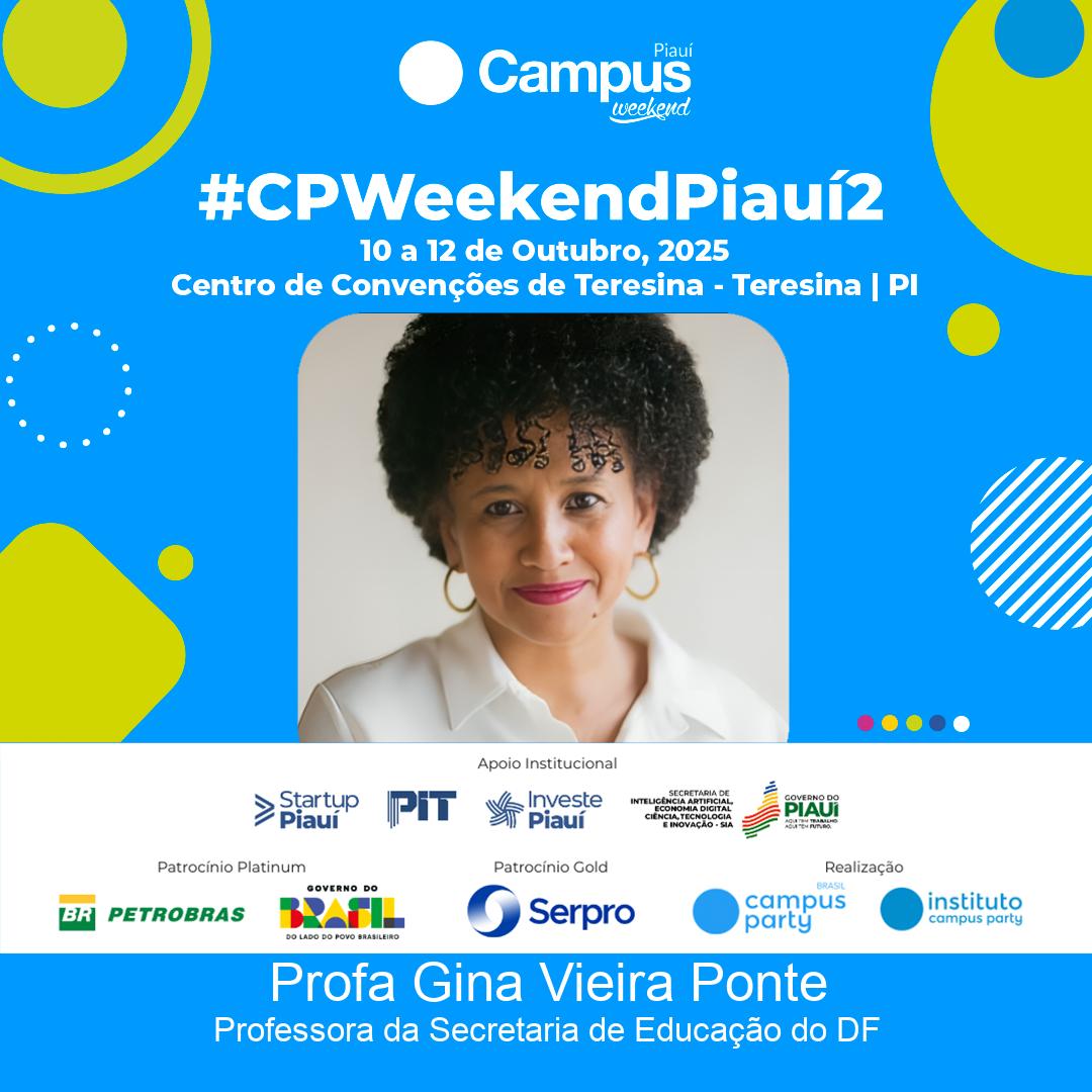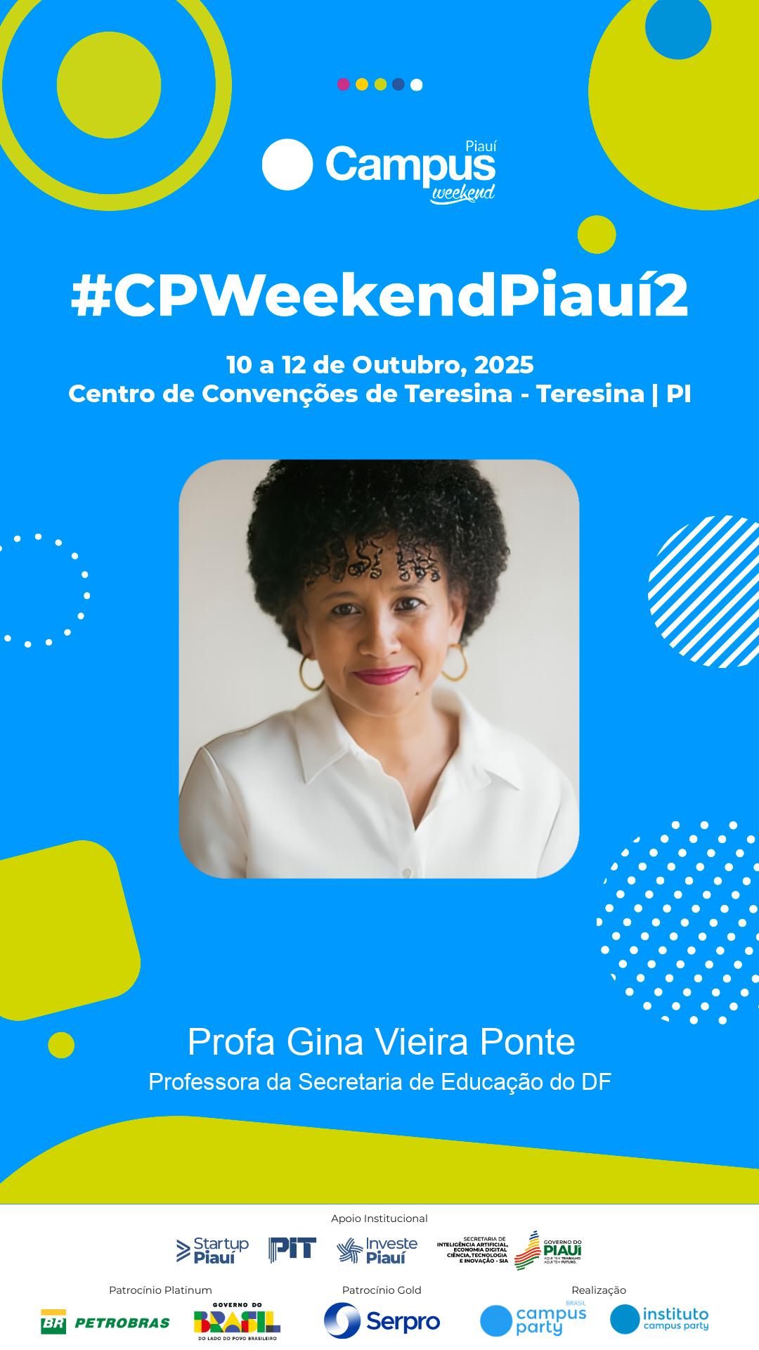 Gina Vieira Ponte é professora da Secretaria de Educação do Distrito Federal desde 1991. Graduada em Letras pela Universidade Católica de Brasília e pós-graduada pela UnB em áreas como Educação a Distância, Inclusão Escolar e Letramentos, é autora do premiado Projeto Mulheres Inspiradoras. Defensora da educação para a igualdade étnico-racial e de gênero, acredita no poder da escola como instrumento de fortalecimento da democracia e transformação social.