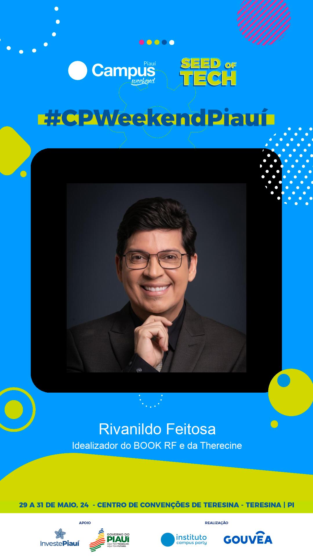 Rivanildo Feitosa é jornalista, apresentador e romancista com 25 anos de experiência regional, especializado em Telejornalismo pela UFPI. Autor de três romances, incluindo \"Pequenas Mortes dos Brutos\", e estreou no cinema em 2023 com o curta \"Gorete Canivete\". Trabalha temas sociais e regionais, adaptando seu primeiro romance \"O Macho e Fêmea\" para o cinema com projetos aprovados na LPG e Ancine. É produtor cultural, idealizador do BOOK RF e da Therecine, e atua nas redes sociais com foco em arte, cultura e viagens.